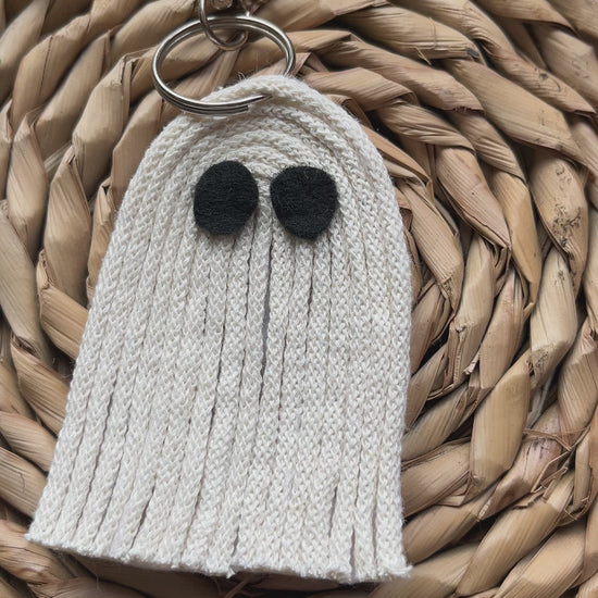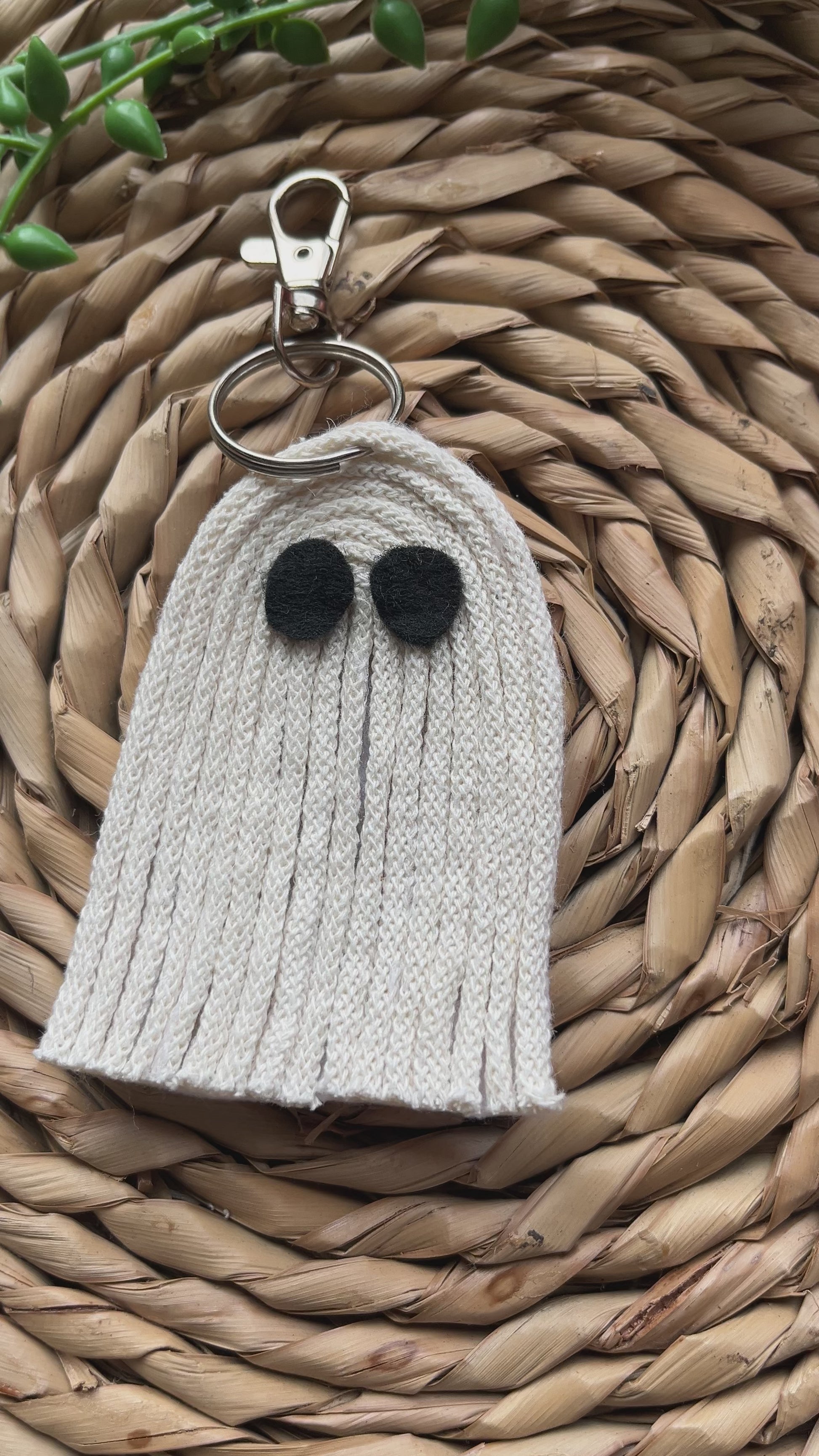 Each ghost keyring is handmade to order from recycled cotton braided yarn, with small felt eyes and a soft white felt backing.