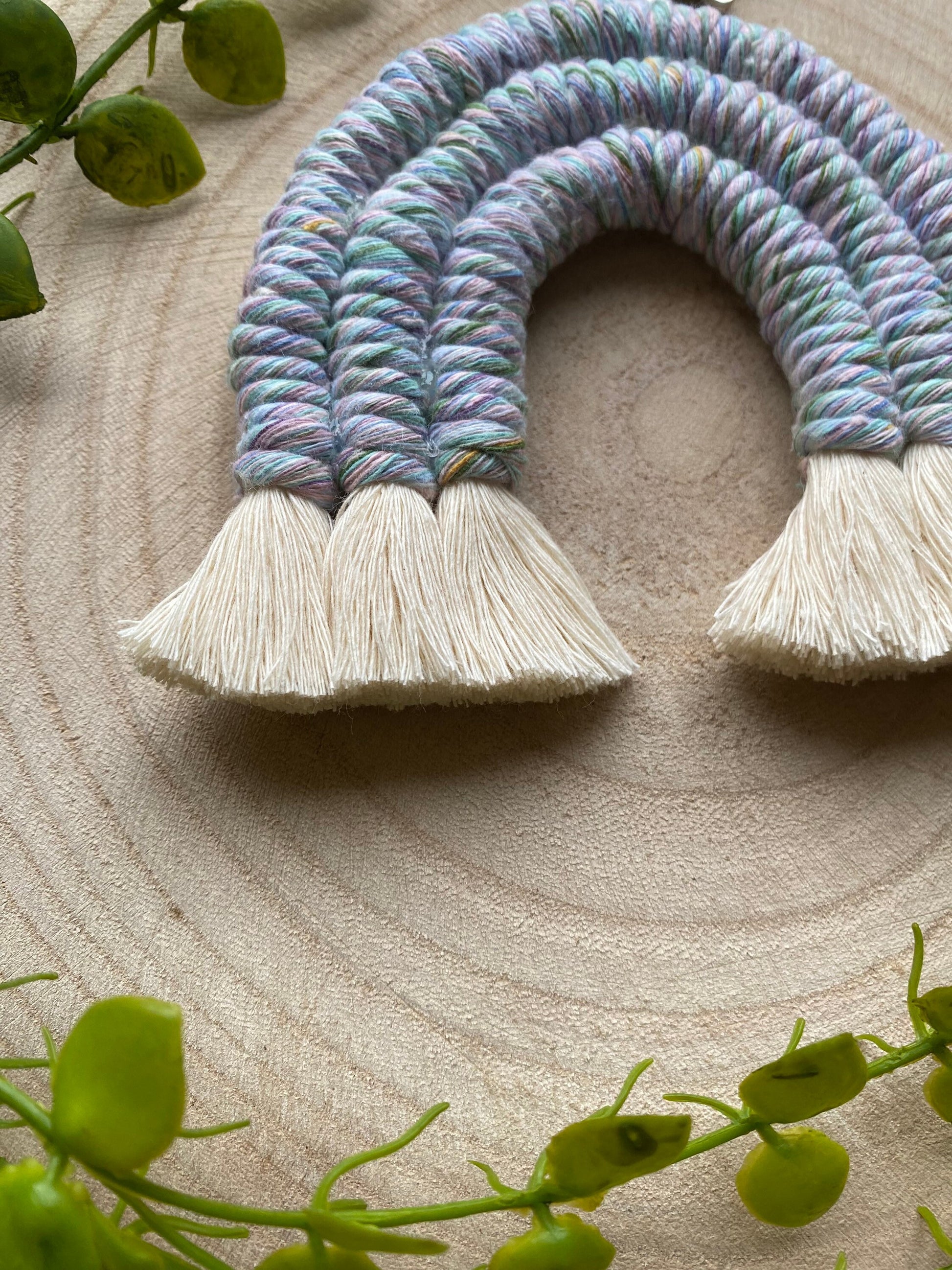 Handmade rainbow keyring, made with a chunky cotton centre, and wrapped with pastel rainbow recycled cotton called “enchanted”.
